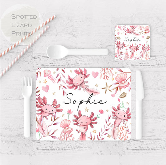 Personalised Axolotl Placemat and Coaster Set, Kid's Dinner Set, Axolotl gift, Children's Birthday Gift, Axolotl Placemat