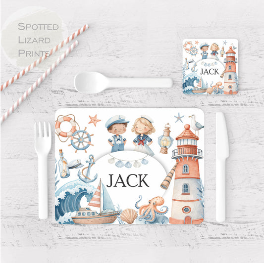Personalised Lighthouse and Sea Adventure Placemat and Coaster Set, Kid's Dinner Set, Pirate gift, Children's Birthday Gift
