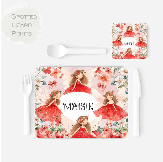 Personalised Strawberry Fairies Placemat and Coaster Set, Kid's Dinner Set, Fairies gift, Children's Birthday Gift, Fairies Placemat