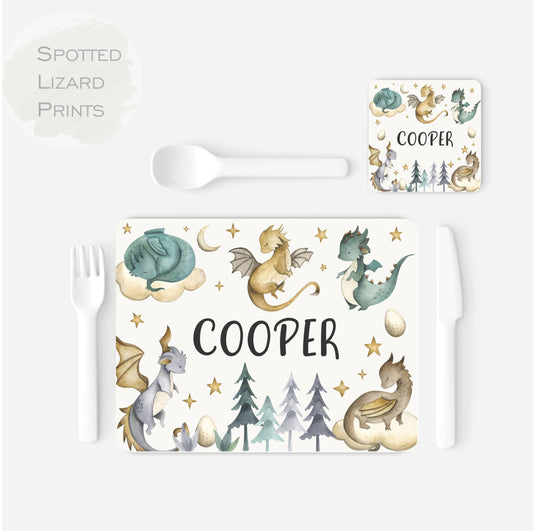 Personalised Dragons Placemat and Coaster Set, Kid's Dinner Set, Little Dragon gift, Children's Birthday Gift, Magical Dragons Placemat