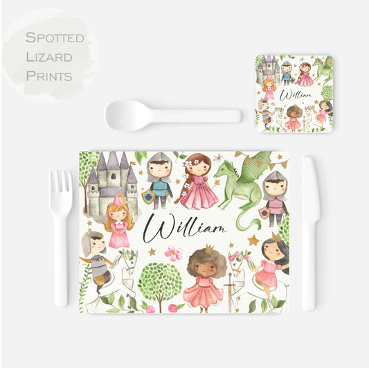 Personalised Once Upon A Time Placemat and Coaster Set, Kid's Dinner Set, Children's Birthday Gift, Knight & Princess Placemat