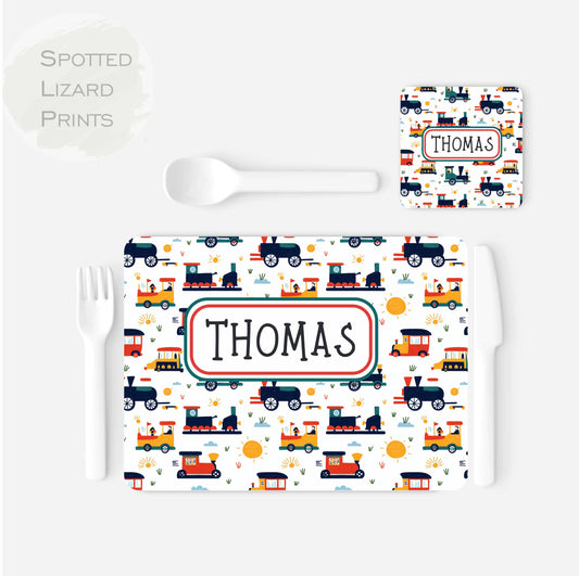 Train placemat - Gift for Kids - Personalised Placemat - Placemat and Coast set - Personalised Tableware - Personalised Coaster - Train kids