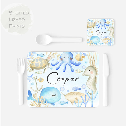 Personalised Under the Sea Placemat and Coaster Set, Kid's Dinner Set, Under the Sea gift, Children's Birthday Gift, Under water Placemat