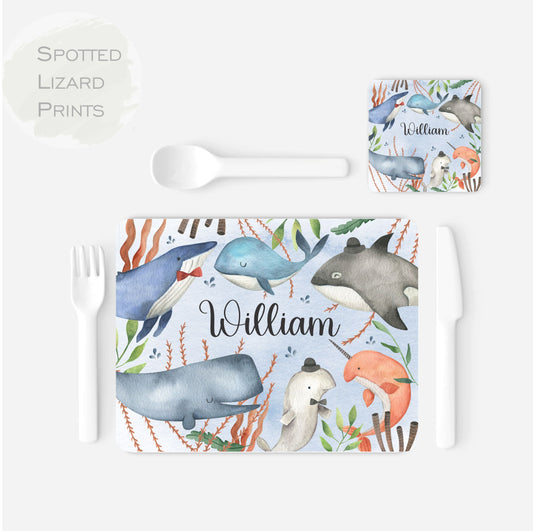 Personalised Whales Placemat and Coaster Set, Kid's Dinner Set, Whales gift, Children's Birthday Gift, Under the Sea Placemat