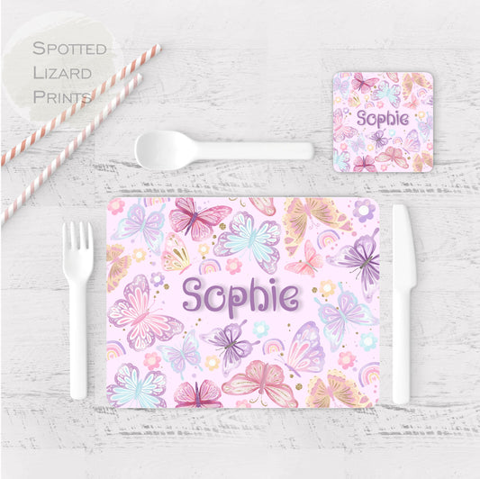 Personalised Butterfly Placemat and Coaster Set, Kid's Dinner Set, Butterflies gift, Children's Birthday Gift, Butterflies Placemat
