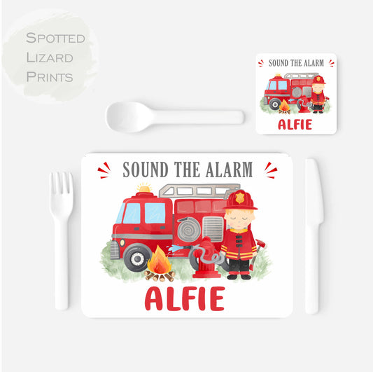 Personalised Fire Engine Placemat and Coaster Set, Kid's Dinner Set, Fire Engine gift, Children's Birthday Gift, Fire Engine Placemat