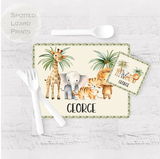 Personalised Safari Placemat and Coaster Set, Kid's Dinner Set, Safari gift, Children's Birthday Gift, Safari Placemat