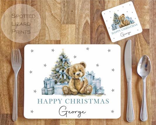 Personalised Christmas Placemat and Coaster Set, Kid's Dinner Set, Christmas gift, Children's Birthday Gift, Christmas Placemat - Teddy