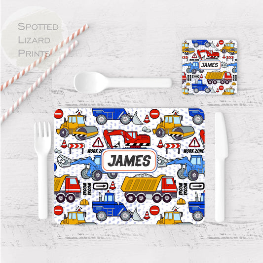 Personalised Trucks Placemat and Coaster Set, Kid's Dinner Set, Trucks gift, Children's Birthday Gift, Trucks Placemat