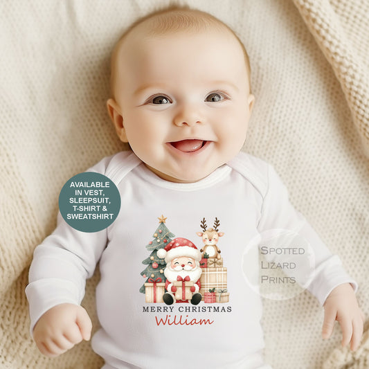 Personalised Christmas Jumper For Children Santa and Reindeer, Xmas Jumper Day, Christmas Sleepsuit, First Christmas T-shirt, Xmas Baby Vest