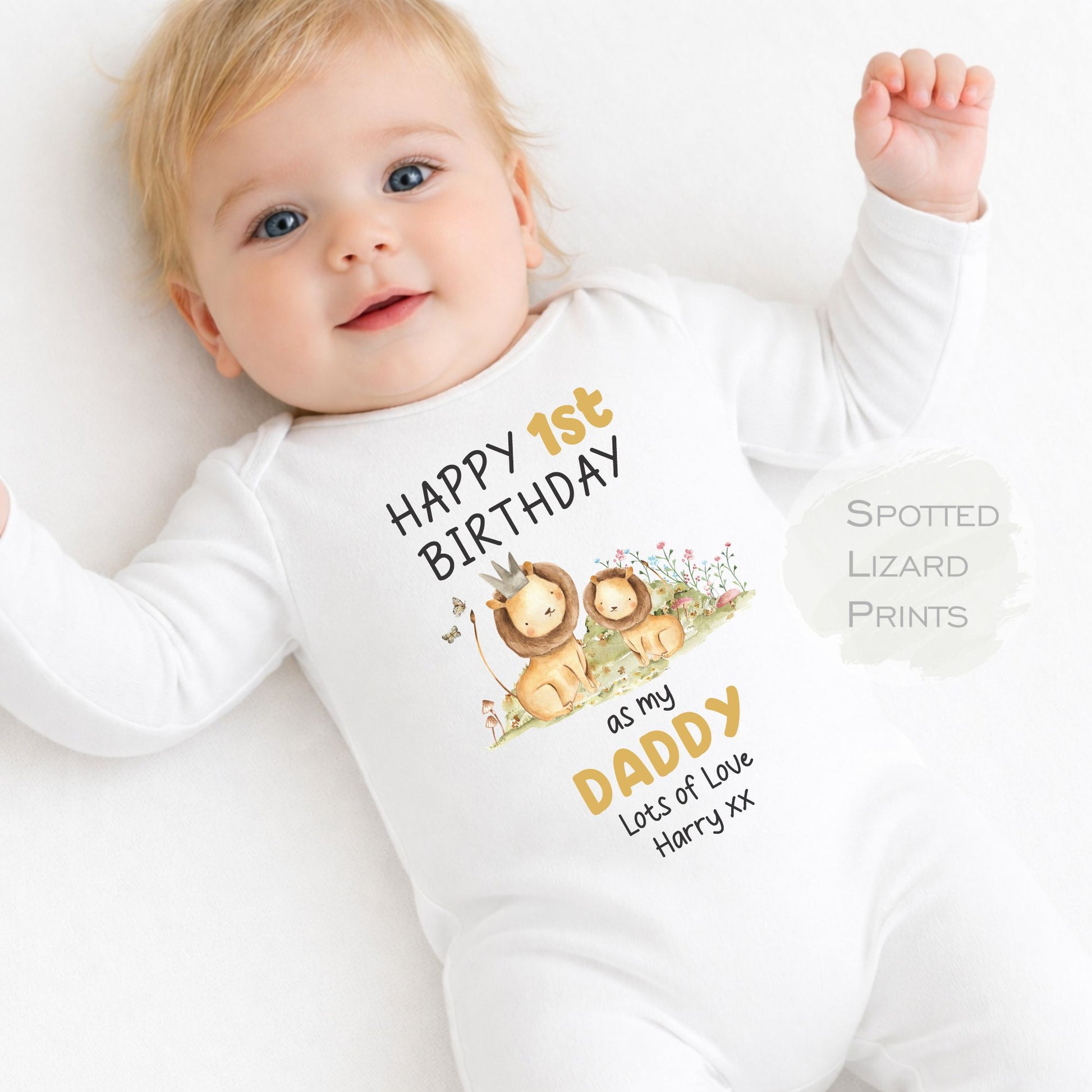Our Baby Vests and sleepsuits are a fantastic way to celebrate Dad's Birthday with a new Baby. These Lion themed Happy 1st Birthday as my Daddy Baby Vests and Sleepsuits can all be personalised for that unique personal touch. We can alter the design and even take special requests to suit your needs.